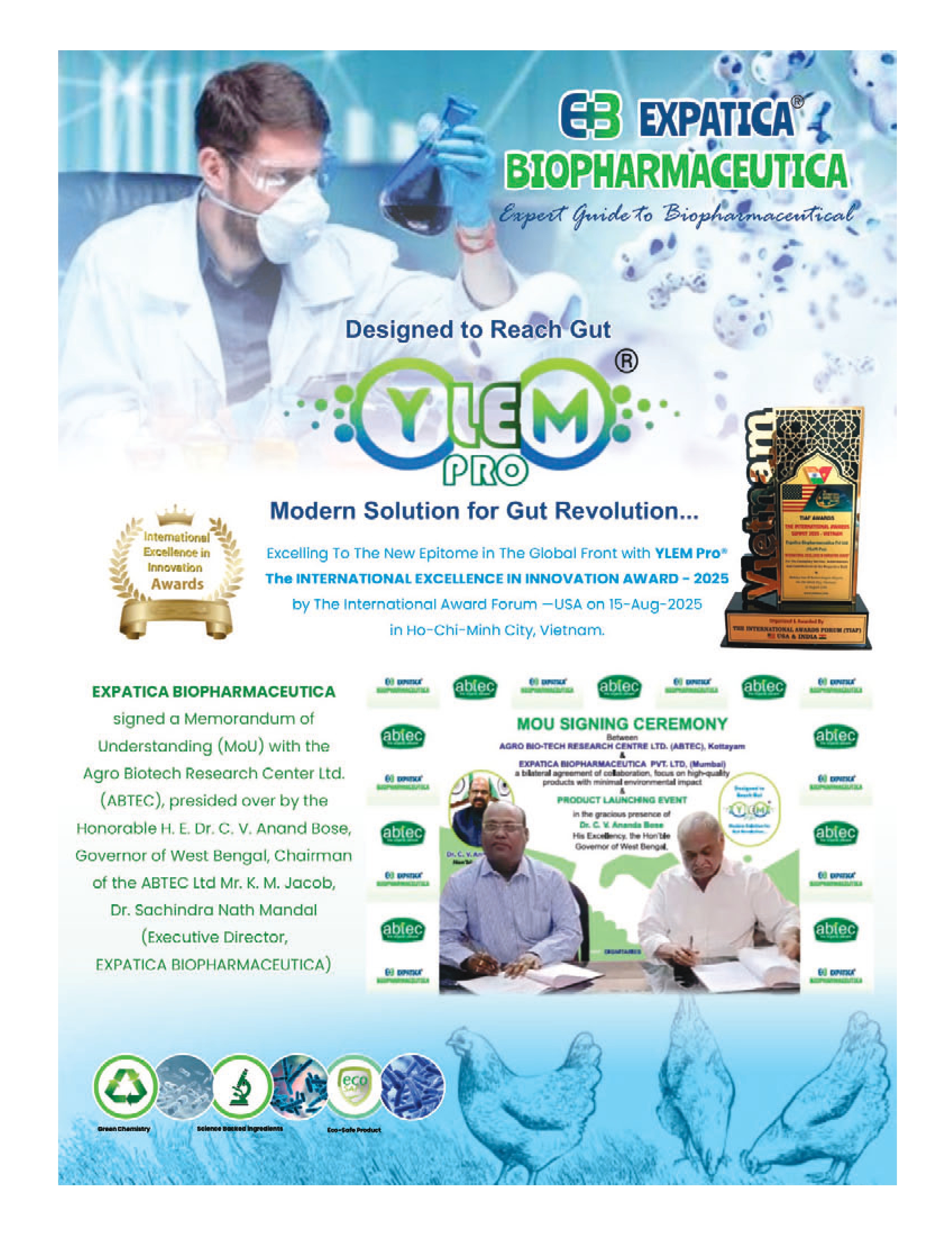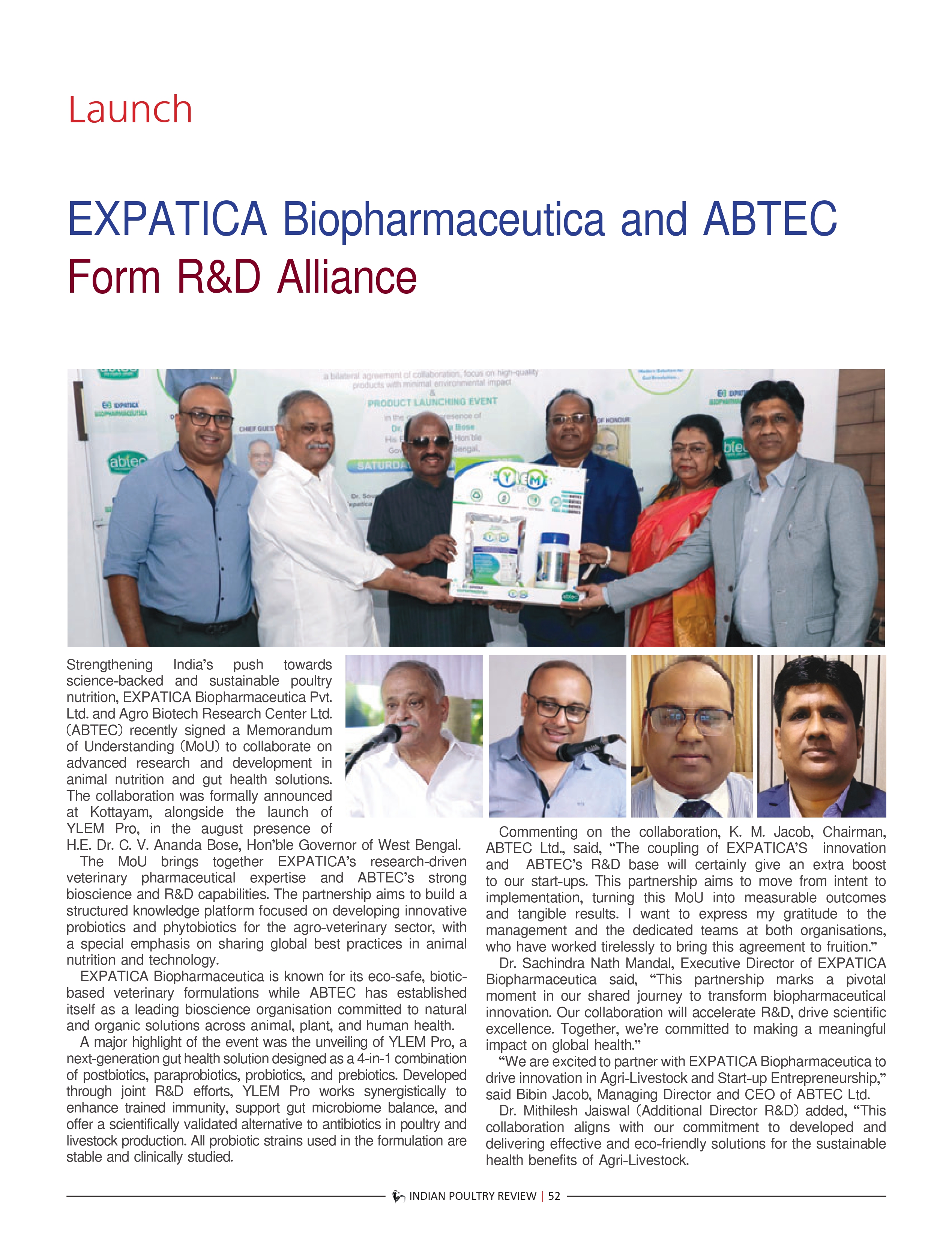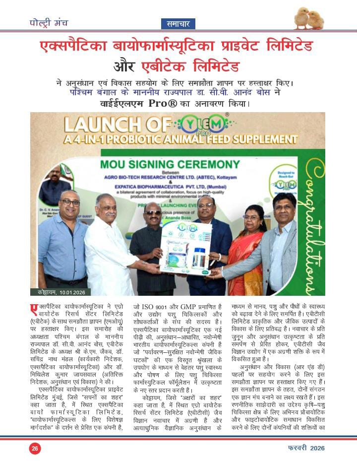ABTEC, in collaboration with EXPATICA BIO PHARMACEUTICA, Mumbai, proudly announce the launch of Ylem Pro, a next generation probiotic based animal feed supplement, unveiled by H.E. Dr. C. V. Ananda Bose, Honorable Governor of West Bengal in the presence of K J Jacob, Chairman ABTEC LTD, Dr. Sachindra Nath Mandal, Director, Expatica Bio Pharma, Dr. Mithilesh Jaiswal, Ms. Sumana Mandal and Bibin Jacob.