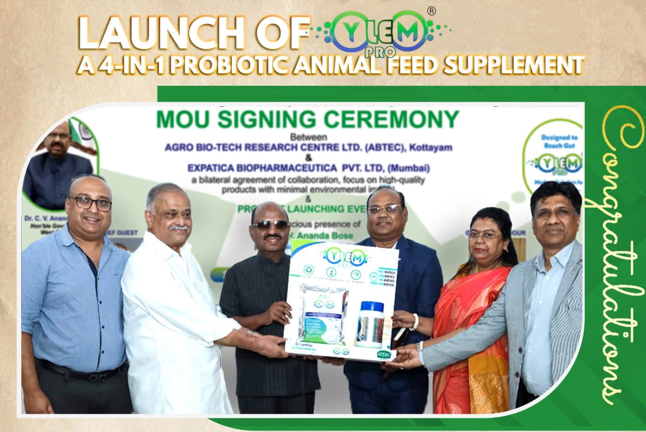 ABTEC, in collaboration with EXPATICA BIO PHARMACEUTICA, Mumbai, proudly announce the launch of Ylem Pro, a next generation probiotic based animal feed supplement, unveiled by H.E. Dr. C. V. Ananda Bose, Honorable Governor of West Bengal in the presence of K J Jacob, Chairman ABTEC LTD, Dr. Sachindra Nath Mandal, Director, Expatica Bio Pharma, Dr. Mithilesh Jaiswal, Ms. Sumana Mandal and Bibin Jacob.